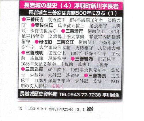 鎌倉時代に豊後に赴任した大友氏、長岩に赴任した三善氏(問注所氏)は、 平家の抑えとして源氏が派遣したものです。 画像は、広報うきはに掲載された長岩城の歴史第四回です。