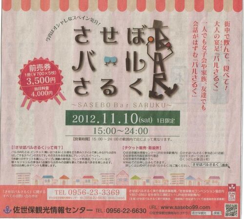 させぼバルさるく どうして「大人の遠足」なんだろう・・・。 お店をはしごして飲み歩くイベントだからなんだな。 お酒を飲まなくても楽しめるイベントなのかな? ・・・わたむし(妻)